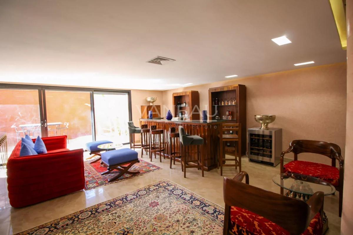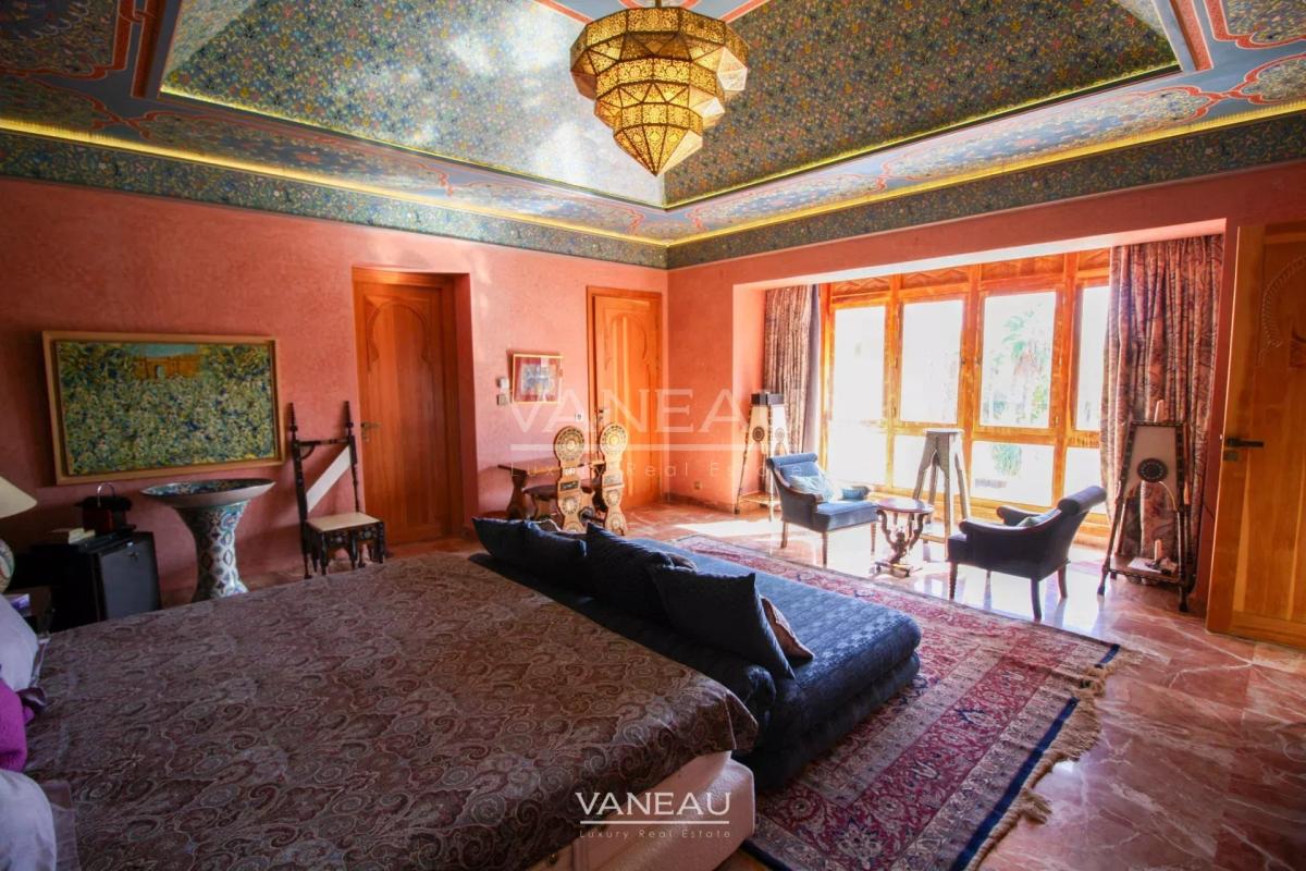 Nestled in the heart of Bab Atlas, within the extension of the Palmeraie, this splendid property spanning 1650 m² of living space on a one-hectare plot will captivate you with its Moorish architecture and luxurious Middle Eastern-inspired decor. Featuring 8 suites, each with its own respective bathroom, the villa offers multiple lounges and terraces, showcasing high-end amenities and finishes. This property also includes a private nightclub of 400 m² in the basement, an outdoor gym, a hammam, a massage room, and a Caïdal tent for grand events. If you are in search of a true palace worthy of the tales of One Thousand and One Nights, do not hesitate to contact us.