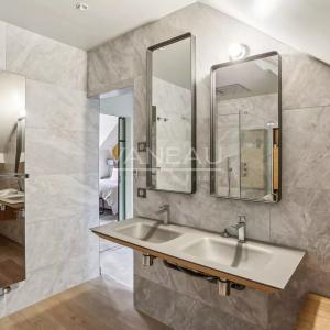 Neuilly-sur-Seine - Perronet - Hôtel Particulier -8 - pièces-Terrasse. Au calme d'une voie privée, élégant hôtel particulier de huit pièces distribuées sur quatre niveaux, d'une surface de 350m² et rénové avec raffinement. Au premier niveau, une entrée, une chambre avec une salle de bains et des toilettes, un espace bien-être avec un sauna et une douche, une buanderie, un local technique et des toilettes invités. Au premier étage, une triple réception exposée sud-est et une cuisine américaine avec espace dînatoire ouvrent sur une terrasse arborée à l'abri des regards. Au deuxième étage, deux chambres avec salle de bains partagent un dressing et des toilettes indépendantes. Au dernier étage, une vaste suite parentale avec salle de bains, dressing et toilettes. Un emplacement de parking dans la voie privée complète ce bien d'exception. Sectorisation lycée Pasteur.